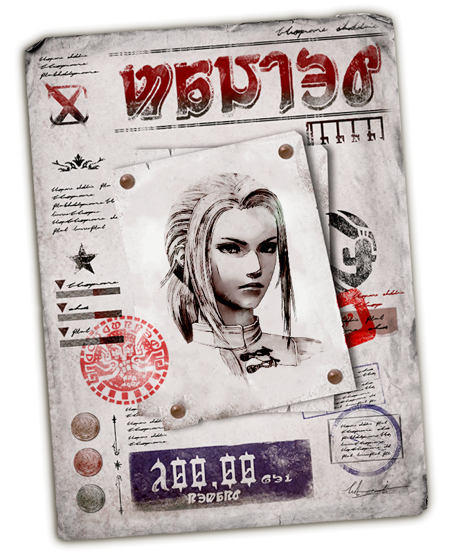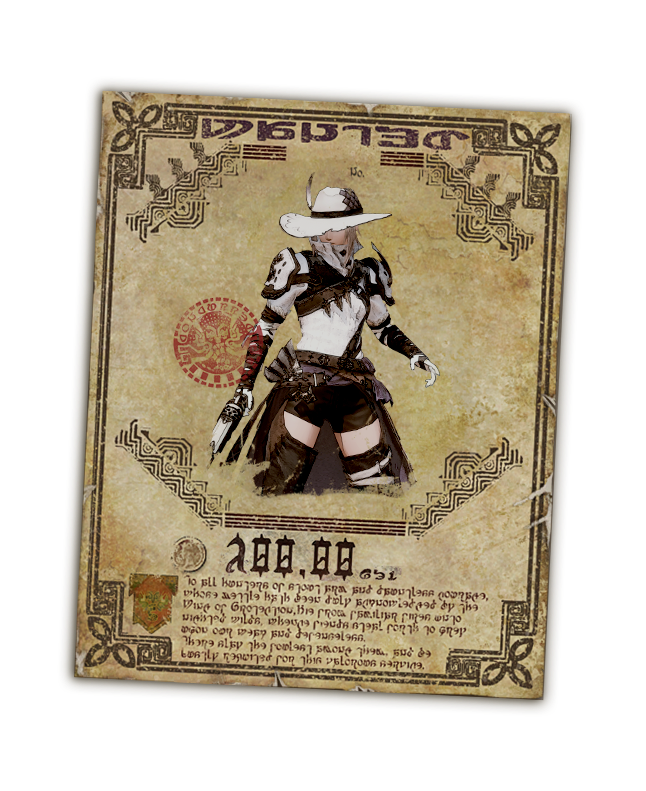 VAROVA is a foreign female hyur of Gyr Abanian origin, 30s, lithe build. NOTABLE FEATURES include and light-colored hair and eyes of two differing colors; one brown, the other a piercing pale violet. Sightings frequently describe Varova in a white coat and hat, bearing a gold revolver. Reports of encounters with Varova describe her as having an UNNATURAL, UNNERVING PRESENCE and has been seen SPEAKING TO HERSELF as if madness has taken her.